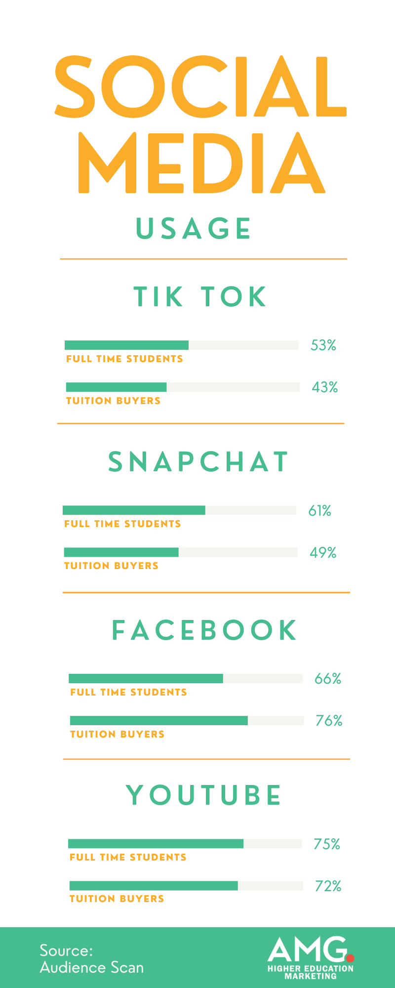 Direct mail is TWICE as expensive as digital marketing, so enrollment marketers should double down on on digital. Social media is a great way to reach both students and tuition buyers as it is now used daily by the majority of both groups.
