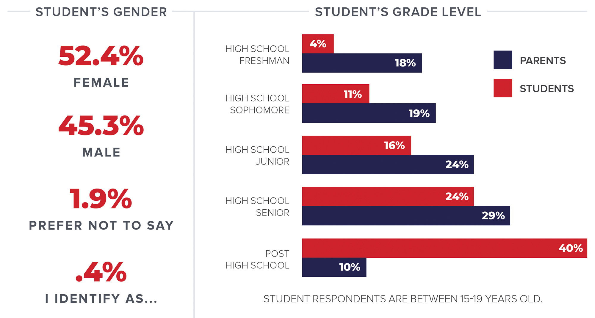 Advance Education surveyed more than 500 high school students and over 500 parents of high school students about their journey to decide what’s next after high school graduation. The respondent samples were taken from all 50 states in quantities representative to the population.