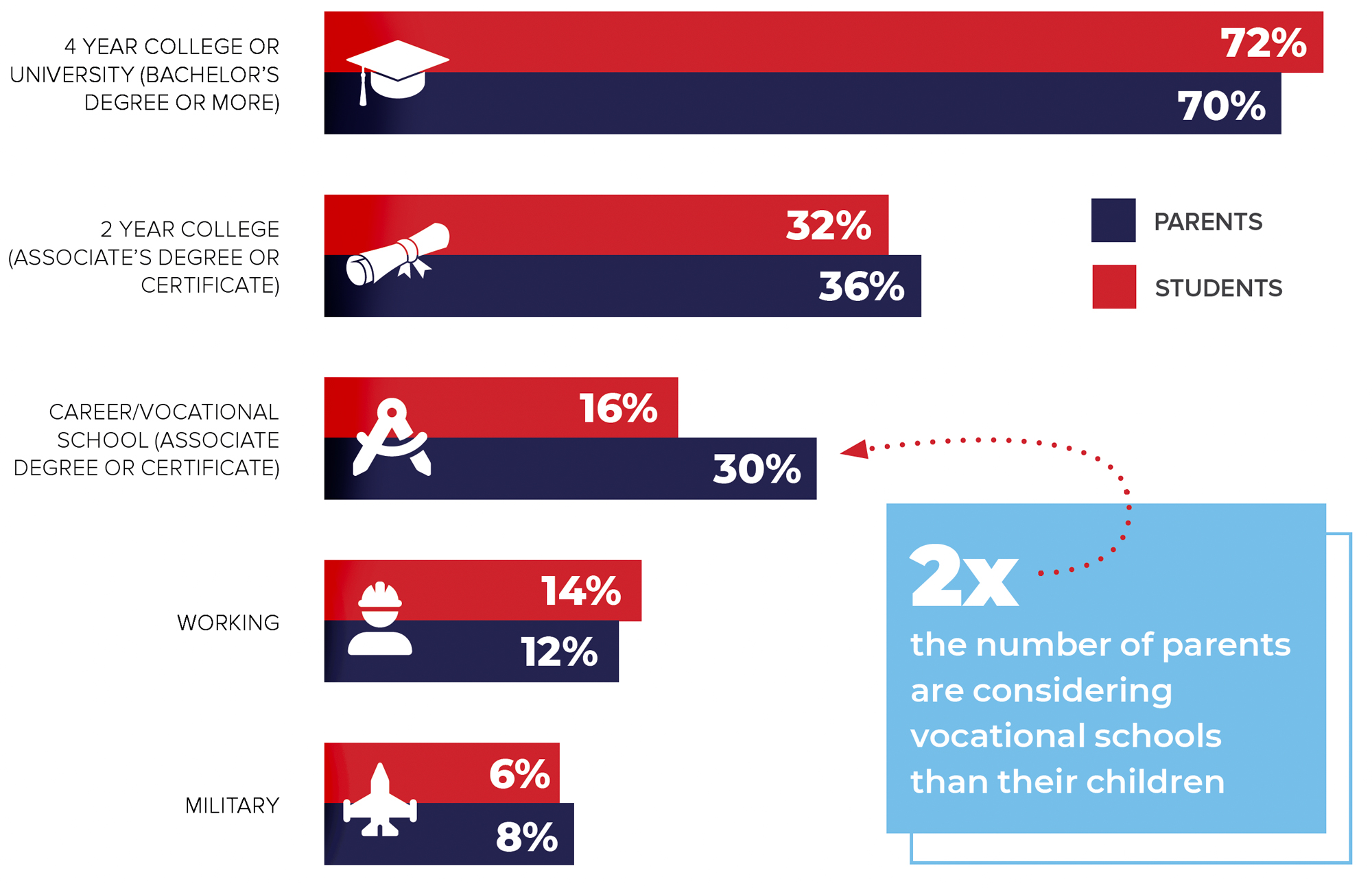 the number of parents are considering vocational schools than their children