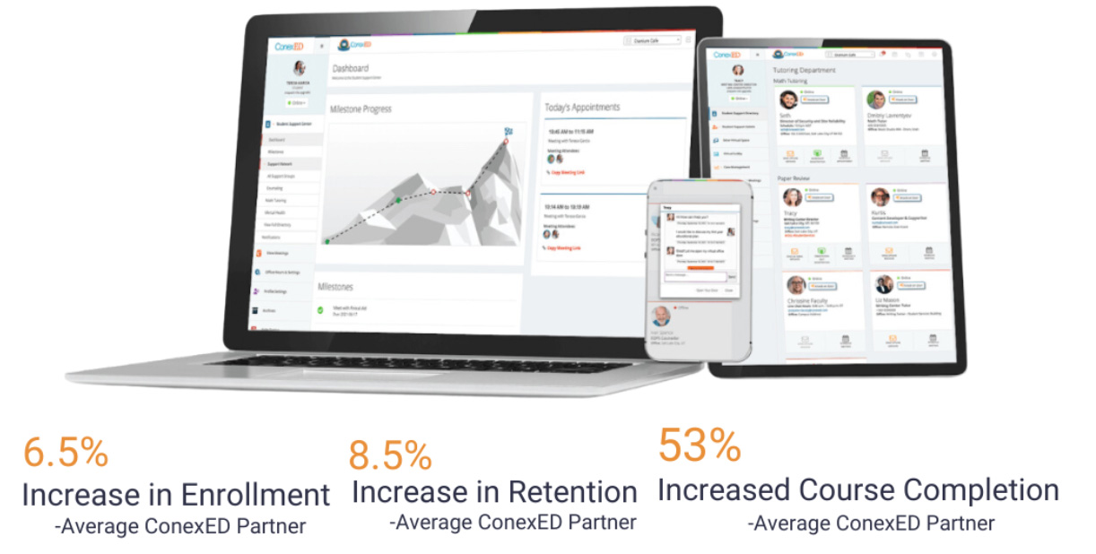 ConexED provides an effective and pragmatic solution for the changes to be made for your institutional outreach. Features in the ConexED platform permits design of personalized student engagement experiences that integrate onboarding, campus communication, document submissions and advising.