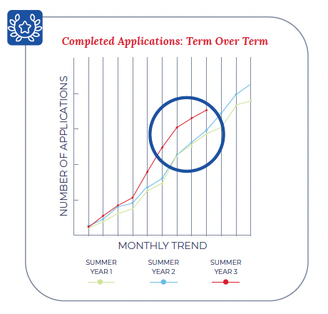 Recent campaigns for Advance Education clients have demonstrated the tangible impact of audience segmentation on enrollment outcomes. Utilizing targeted segmentation strategies, such as personalizing communication based on the preferences and behaviors of distinct audience segments, institutions have witnessed a substantial uplift in their conversion rates and overall enrollment figures. These results showcase the real-world effectiveness of leveraging analysis insights to drive audience segmentation and its direct correlation to positive outcomes in enrollment marketing. For example, an Advance Education client experienced noticeable shifts in 2024 (purple line) with more prospective students starting applications moving through to application completion compared to previous years.