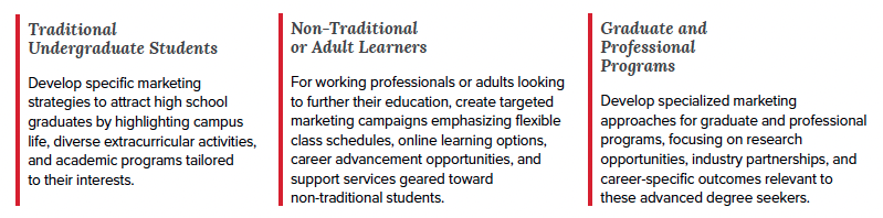Designing marketing strategies aligned with audience segments is critical for educational institutions to engage prospective students effectively and drive enrollment. Different audience segments have unique preferences, needs, and behaviors, so tailoring marketing strategies to address these specific characteristics can enhance your institution’s appeal and resonate with your segmented audiences. For example: