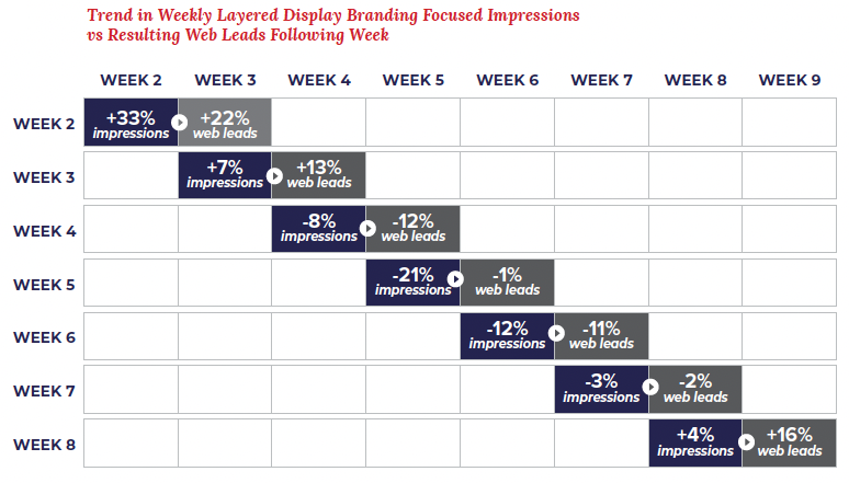 This chart demonstrates how an Advance Education client’s weekly application submissions increased or decreased in direct correlation to a change in the campaign’s previous week branding focused impressions.