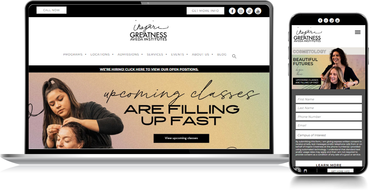 With ongoing analysis and strategic thinking, we experienced a creative breakthrough when we pivoted from using stock imagery to assets produced by the client’s on-location photoshoots. With five unique campuses in three states, the imagery authentically represented the different demographics of their student body.